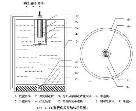 圖一為 LYCB-JT1 的結(jié)構(gòu)示意,由圖可見 LYCB-JT1 是由兩只同心的塑料套筒和附著在塑料筒底部的有同心孔的鋼盤所組成。其中內(nèi)塑料筒 1 內(nèi)置由高純銅或鋅制成的電極 2 和飽和硫酸銅溶液或鋅鹽溶液 3 并且在內(nèi)筒 1 的底部開孔并通過半透膜 4 和外塑料筒 5 相連通。外筒 5 內(nèi)充滿惰性飽和電解質(zhì)溶液并在筒的底部設(shè)有一突出的與鋼盤 9 同心的塑料短管 6。短管 6 內(nèi)鑲有半透膜和微孔陶瓷。這樣外筒 5 就成為內(nèi)筒 1 所構(gòu)成參比電極的緩沖鹽橋并將鹽橋的開孔通過絕緣的塑料短管 6 和半透膜微孔陶瓷 7 置于鋼盤 9 的中央空心內(nèi),即鋼盤 9 是環(huán)繞在鹽橋孔的四周。